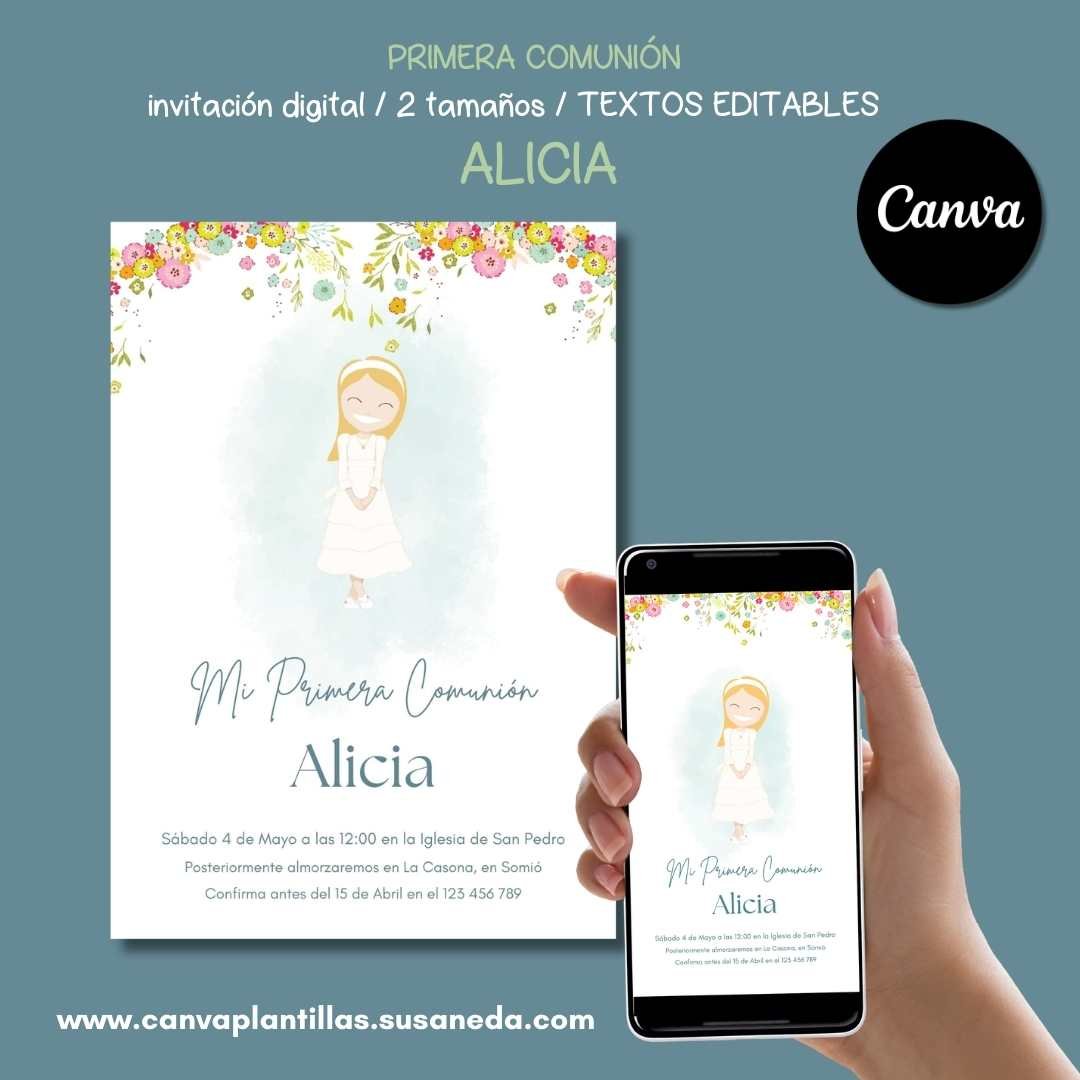 Alicia invitación Comunión editable en CANVA