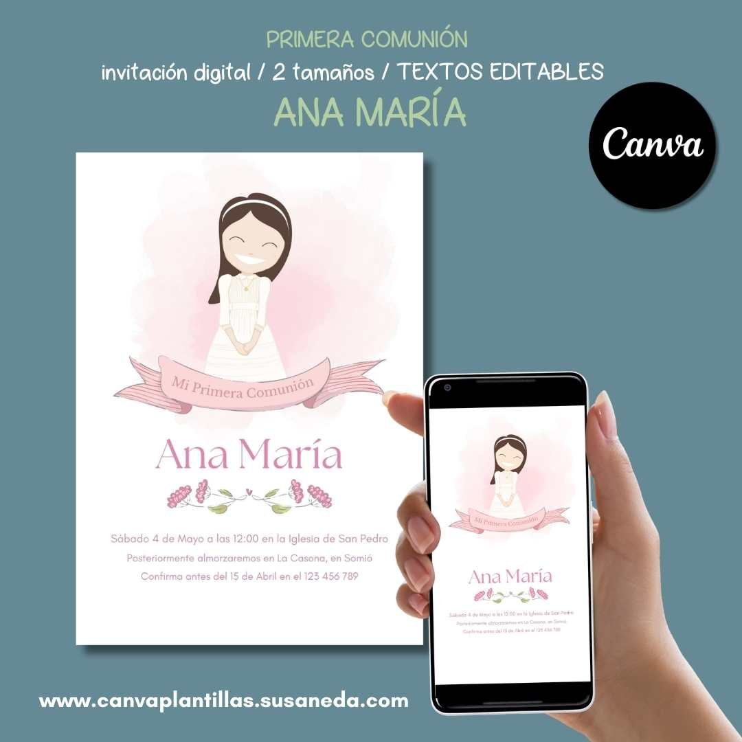Ana María invitación de Comunión editable en CANVA. En dos tamaños, uno para imprimir y otro para enviar por WhatsApp.