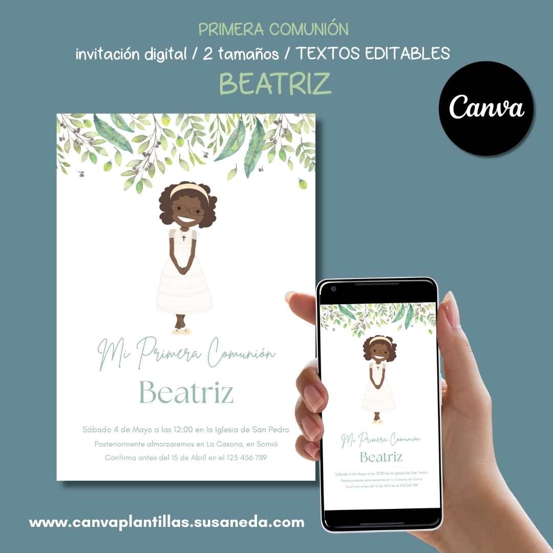 Beatriz invitación Comunión editable en CANVA