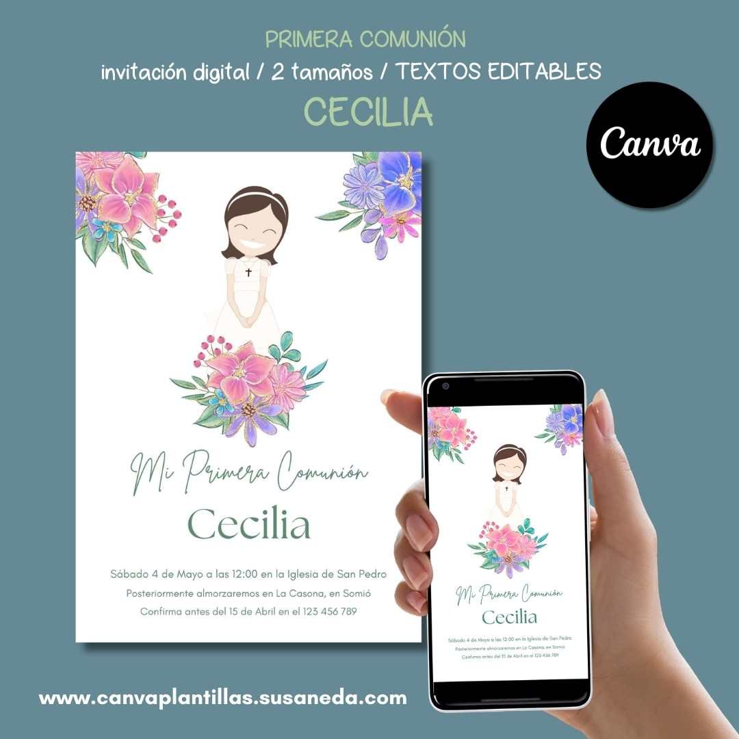 Cecilia invitación Comunión editable en CANVA