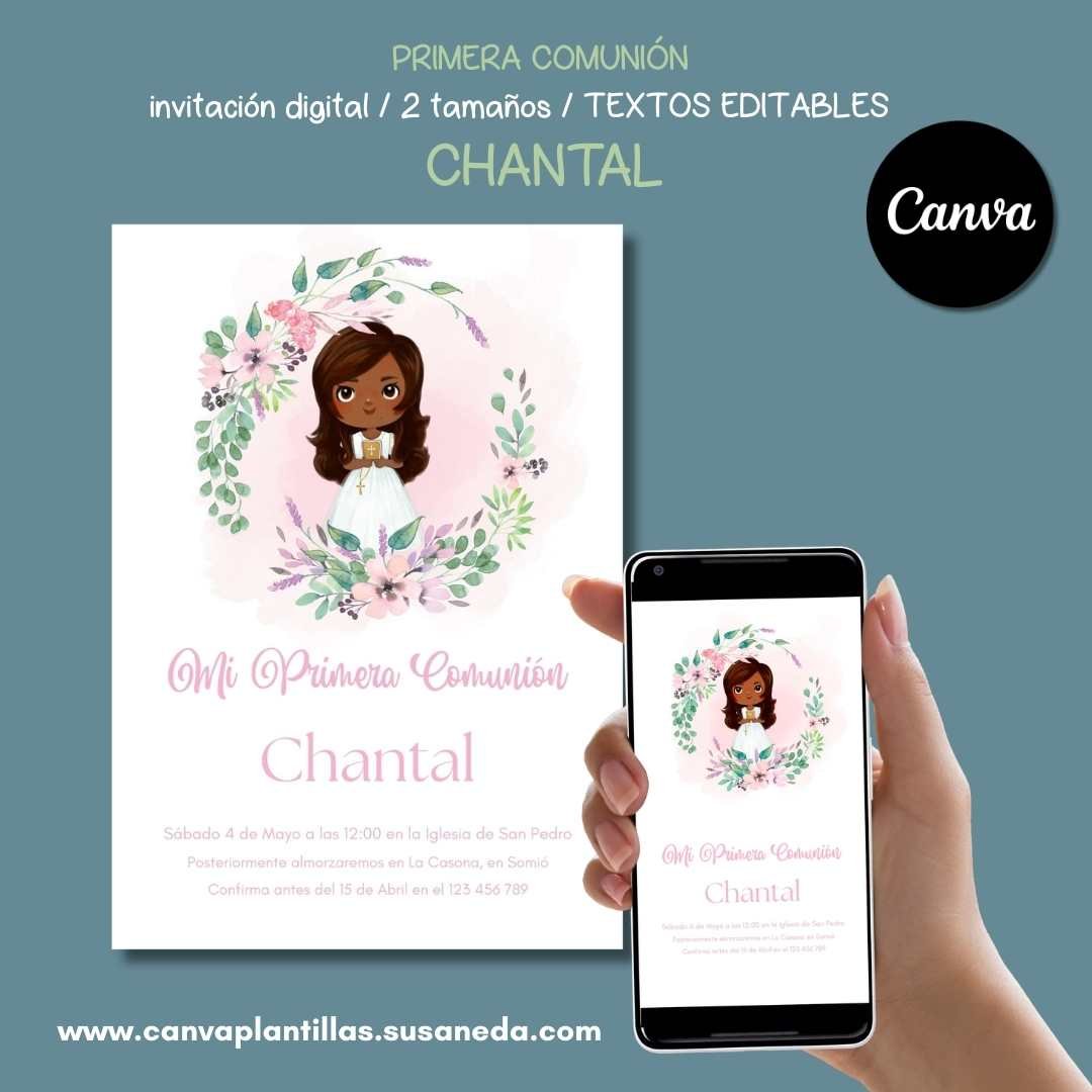 Chantal invitación de Comunión editable en CANVA. En dos tamaños, uno para imprimir y otro para enviar por WhatsApp.