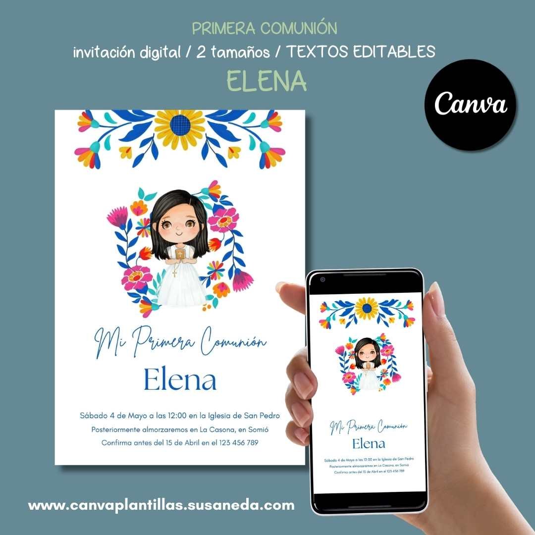 Elena invitación de Comunión editable en CANVA. En dos tamaños, uno para imprimir y otro para enviar por WhatsApp.