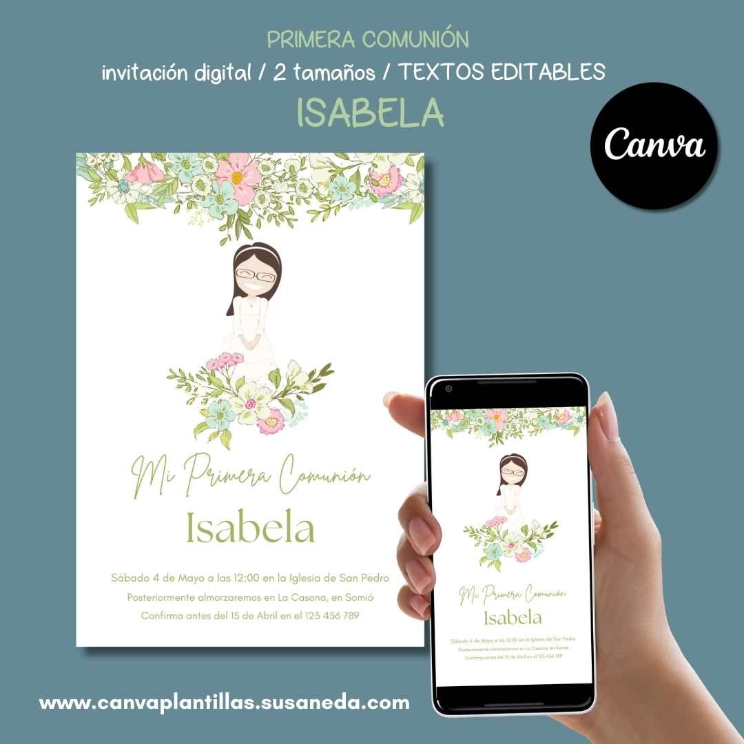 Isabela invitación Comunión editable en CANVA
