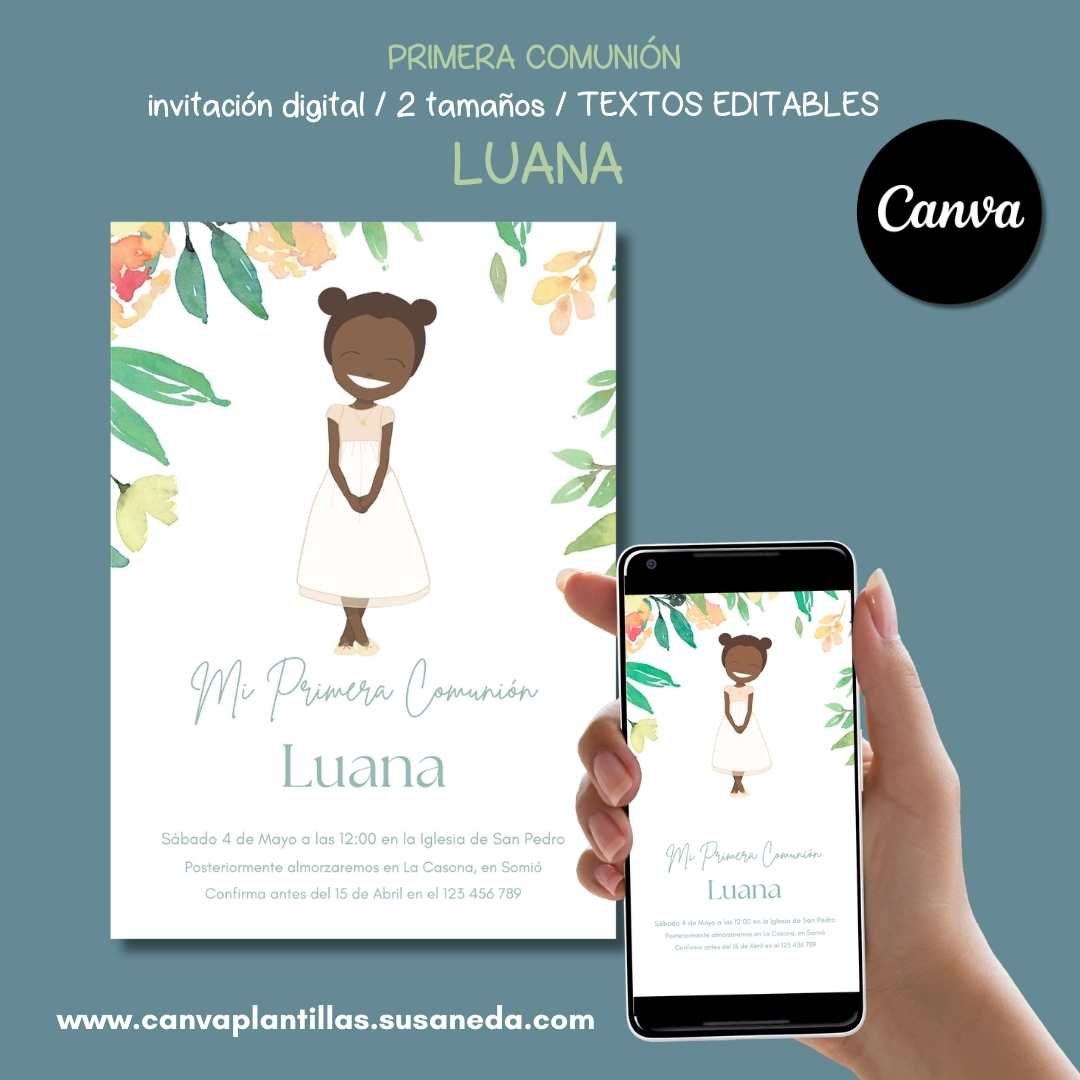 Luana invitación de Comunión editable en CANVA. En dos tamaños, uno para imprimir y otro para enviar por WhatsApp.