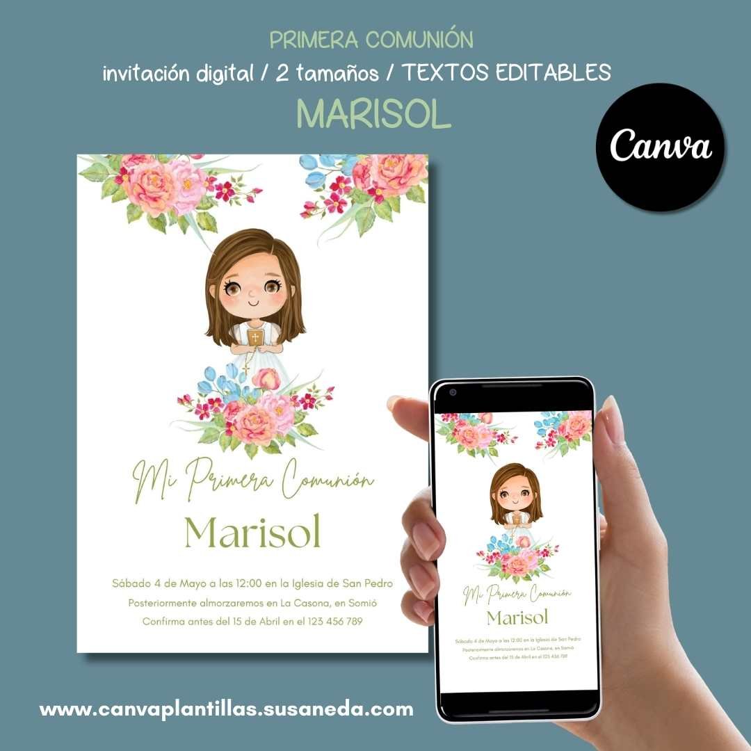 Marisol invitación de Comunión editable en CANVA. En dos tamaños, uno para imprimir y otro para enviar por WhatsApp.