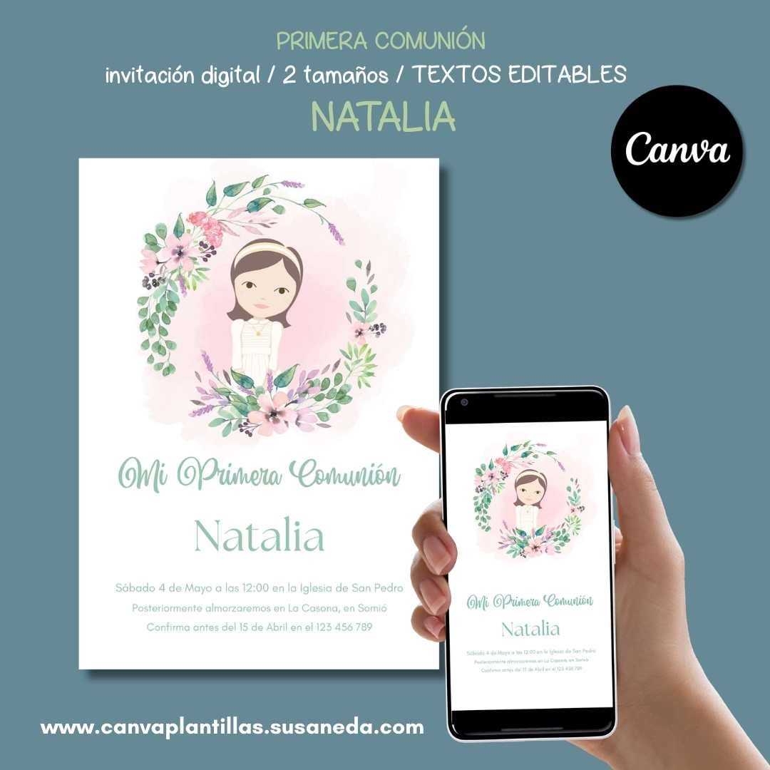 Natalia invitación de Comunión editable en CANVA. En dos tamaños, uno para imprimir y otro para enviar por WhatsApp.