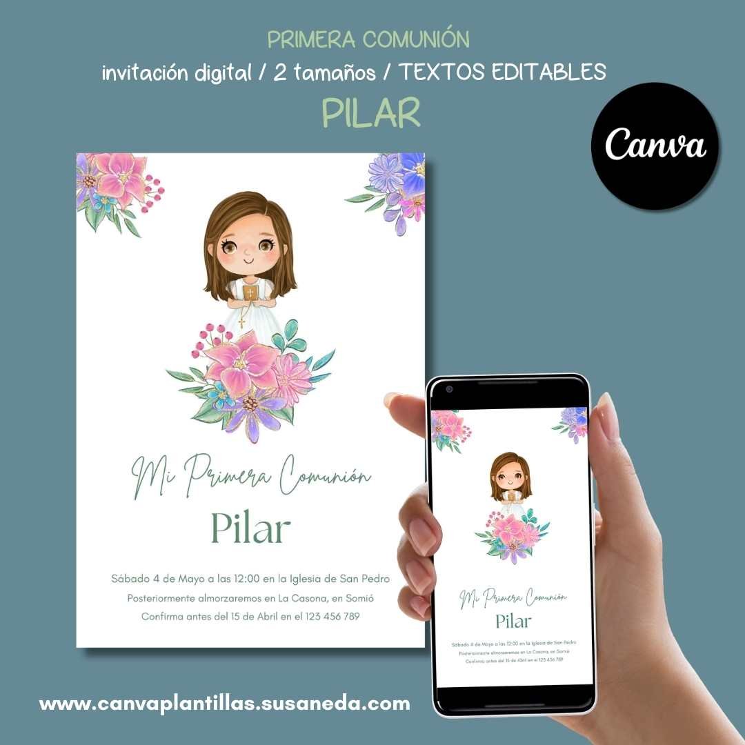 Pilar plantilla de invitación de Comunión editable en CanvaPilar invitación Comunión editable en CANVA