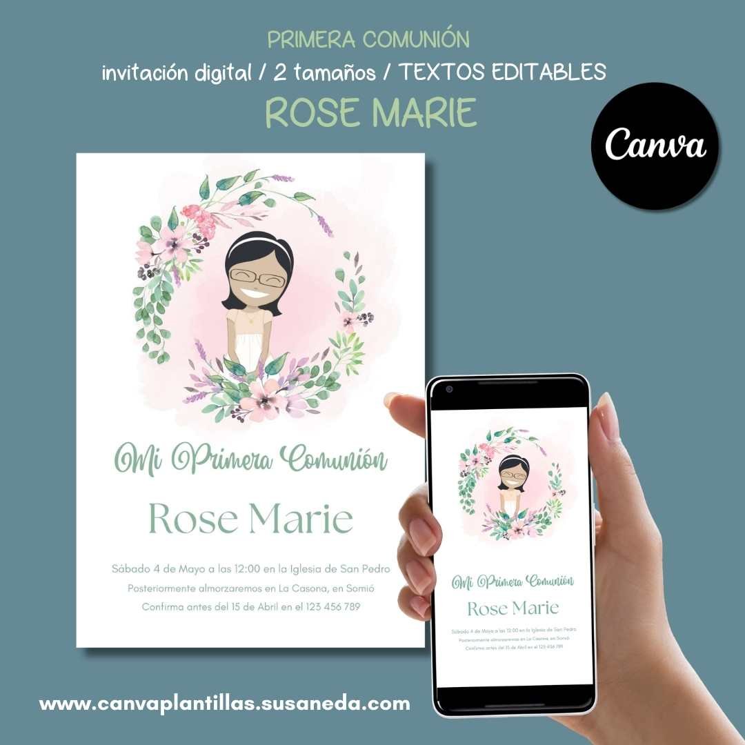 Rose Marie invitación de Comunión editable en CANVA. En dos tamaños, uno para imprimir y otro para enviar por WhatsApp.