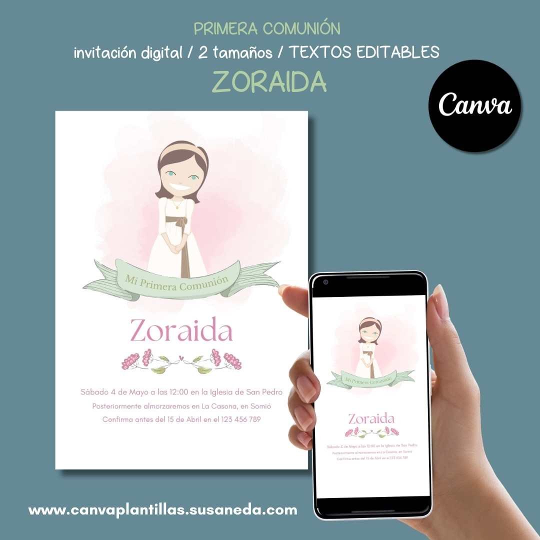 Zoraida plantilla de invitación editable en CanvaZoraida invitación Comunión editable en CANVA